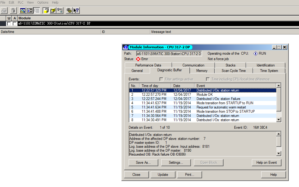年前一臺(tái)S7-300低頻偶發(fā)故障,原因沒搞明白,求指教。模塊信息如下。PS:診斷信息的txt發(fā)不上來,這個(gè)哪位知道咋回事?