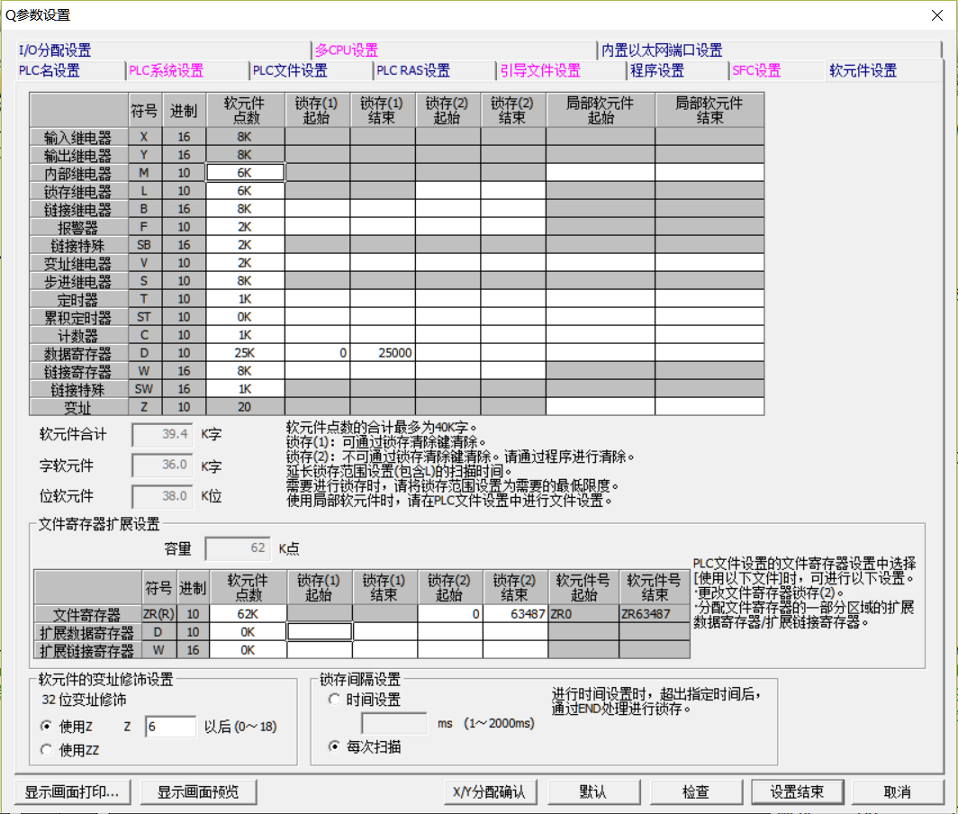 我現(xiàn)在用的三菱q系列PLC,軟元件合計38.8的時候沒啥問題,可是我把軟元件設置為如附件那樣的39.4的時候,PLC就會出現(xiàn)莫名其妙的錯誤,如:程序卡著不動,以前能運行的程序現(xiàn)在全部混亂了,數(shù)據(jù)還出現(xiàn)了亂碼,復位指令沒導通但是置位信號卻執(zhí)行不了。