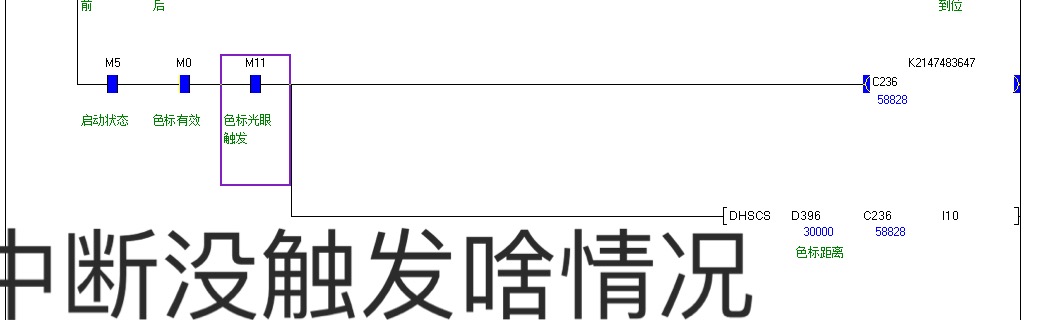 用的三菱的3UPLC,高計端口X1接的是伺服脈沖信號,為什么執行過程中   C236已經達到設定值30000,中斷沒有觸發呢