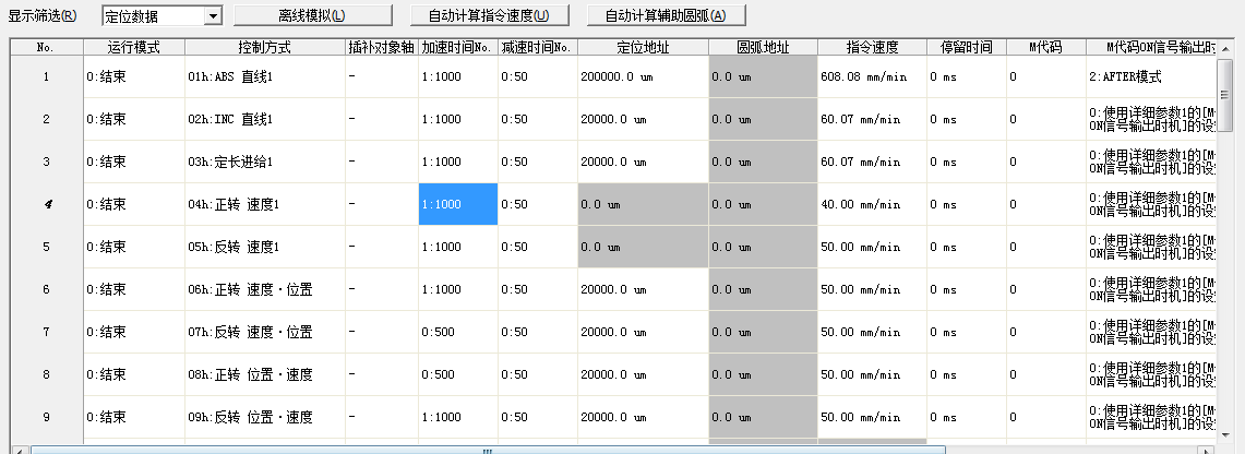 請教各位:在進行定位模塊的測試時,里面可以對定位數據進行測試,也可以進行JOG測試,但是我在測試時,點JOG正/反,電機可以運行,點回機械原點,電機也可以運行,但是我想我對定位數據進行測試時,就會出現524的報錯(控制方式設置出錯。(檢查內容:· 控制方式的設置值超出了范圍! 在連續定位控制、連續軌跡控制中連續執行時控制軸數或插補對象軸與前數據不相同。· 在無配線模式中進行了機械原點復歸、高速原點復歸、速度·位置以及位置·速度切換控制! 在數據No.600的控制方式中設置了NOP指令! 在緩沖存儲器地址1906(禁止使用區)中設置了0以外。))。