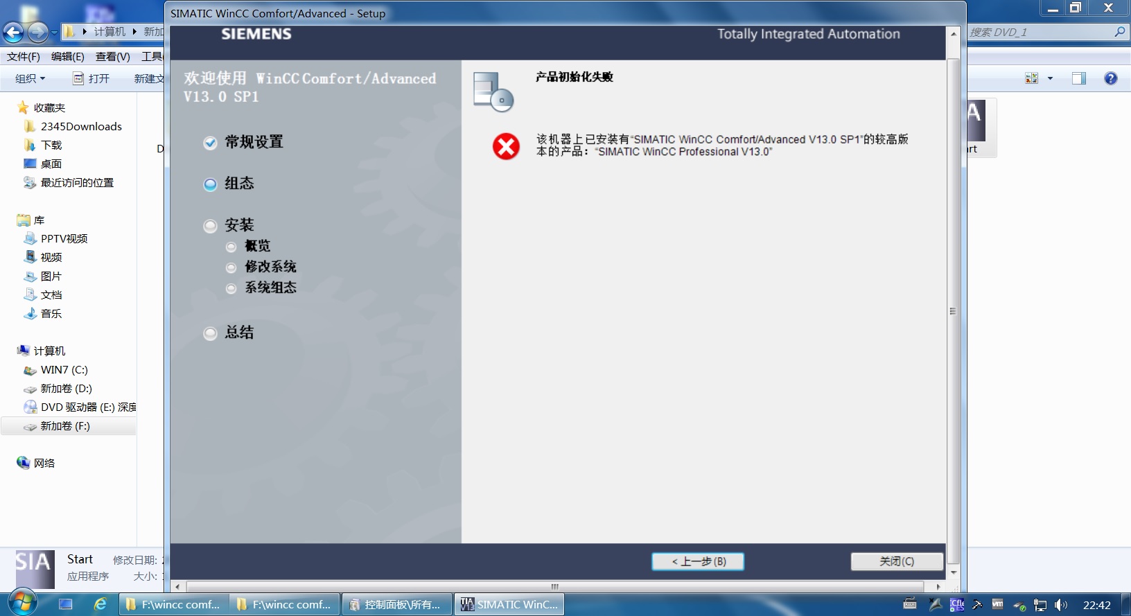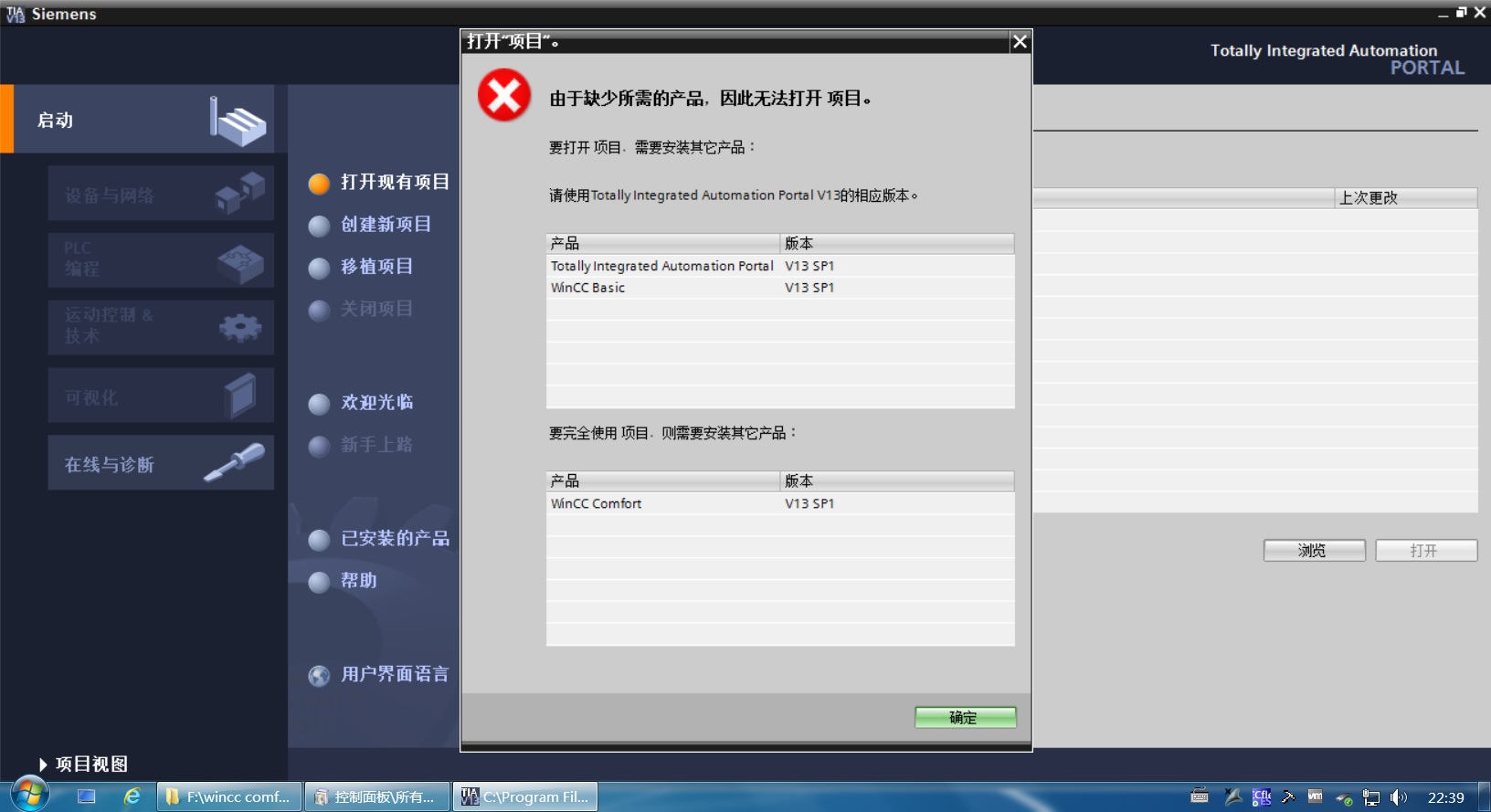 我用公司電腦博途V13打開程序沒問題, 公司電腦是英語的,我自己下了個漢語的,打開時候提示需要安裝wincc comfort,于是下載了TIA V13 SIMATIC_WinCC_Comfort_Advanced_SP1_for_V13, 安裝時候提示 已經安裝更高版本的wincc professional , 如圖所示,請問該如何解決呢。