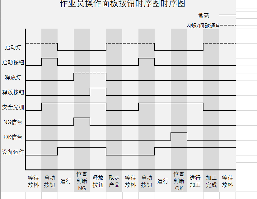 有一個關于基恩士光幕的疑問: 假如有一個沖壓設備,入口放2個光幕,操作員填料后,手拿出來,再按下啟動按鈕。這個過程中,我想讓操作員填料、設備沖壓完成操作員取料2個時間段光幕不動作(即設備不會觸發急停),換言之,光幕觸發僅僅在設備沖壓這個過程中生效,在人取放料時屏蔽,請問可以如何實現呢?(時序圖見附件)