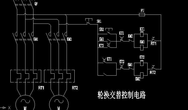 感覺這個電路不一定能實現,因為時間繼電器通斷時會出現競爭,可能無法在吸合或斷開的瞬間保證接觸器正常吸合并保持。應該將時間繼電器放在互鎖電路外。也就是用時間繼電器去保證電路的順序控制,互鎖去保證兩臺電機不同時運行。