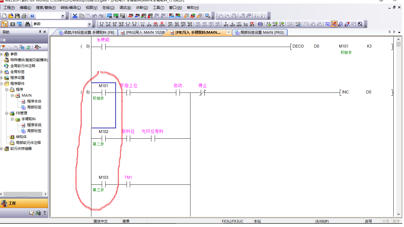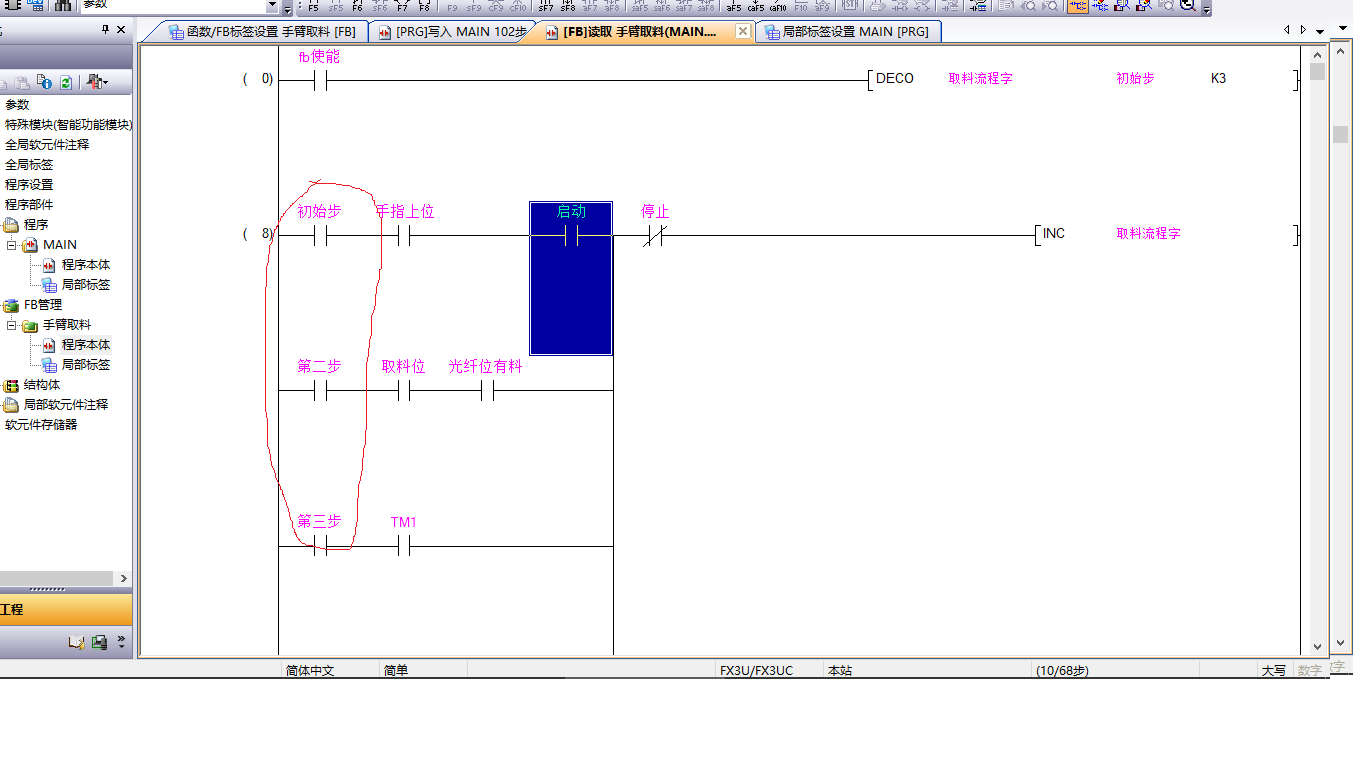 三菱標(biāo)簽編程,如何確定多個(gè)位元件編號(hào)大小關(guān)系,DECO指令中會(huì)有多個(gè)相關(guān)的位元件,而這些位元件是用的局部標(biāo)簽,那么這些標(biāo)簽先后關(guān)系,或者說(shuō)大小關(guān)系怎么來(lái)確立?和他們?cè)诰植繕?biāo)簽表格中位置有無(wú)關(guān)聯(lián)?請(qǐng)大神指教,初次編寫標(biāo)簽程序,下面是我編寫FB測(cè)試程序,可以運(yùn)行,歡迎大家批評(píng)指正. 畫線部分位元件大小與什么有關(guān)