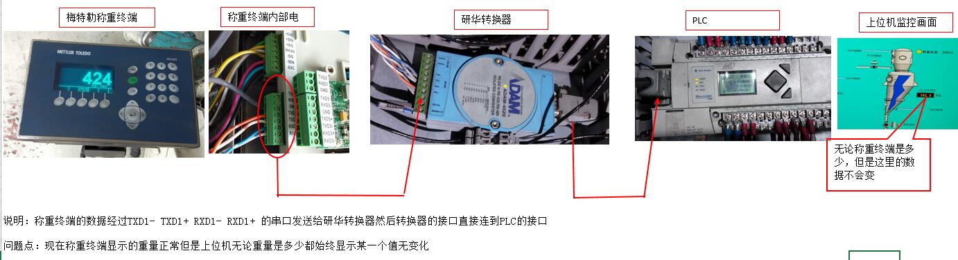 稱重系統是:梅特勒-托利多_稱重終端型號IND560 接4條線TXD1+  TXD1-   RXD1+  RXD1-  這4條線連接到研華轉換器型號是ADMA-4520  然后通過9針接頭接到PLC 上的接口,PLC品牌是美國AB羅克韋爾。