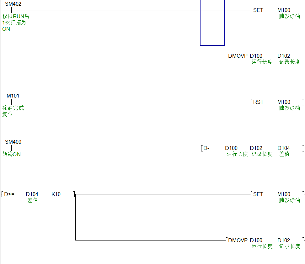 相對位置來寫,每走10米停一下觸發潤滑,潤滑完成再次行走10米,依次循環往復