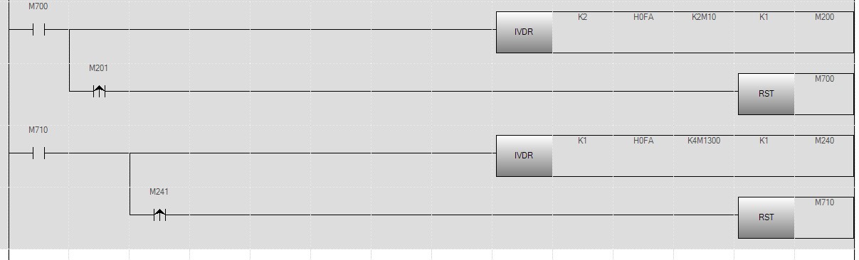 FX5U-32MT/ES       485串口設(shè)置: 協(xié)議格式 變頻器協(xié)議                               數(shù)據(jù)長(zhǎng)度 7bit    偶校驗(yàn)  停止位1位   波特率19200D700變頻器  參數(shù)設(shè)置與之對(duì)應(yīng)上了   而且兩臺(tái)都已經(jīng)與PLC連上  但是不能用IVDR指令同時(shí)讓兩臺(tái)變頻器啟動(dòng)    連著順序?qū)憙蓷lIVDR后不是變頻器報(bào)警就是PLC報(bào)警   已經(jīng)暈了  請(qǐng)路過(guò)的高手賜教。。。。。。