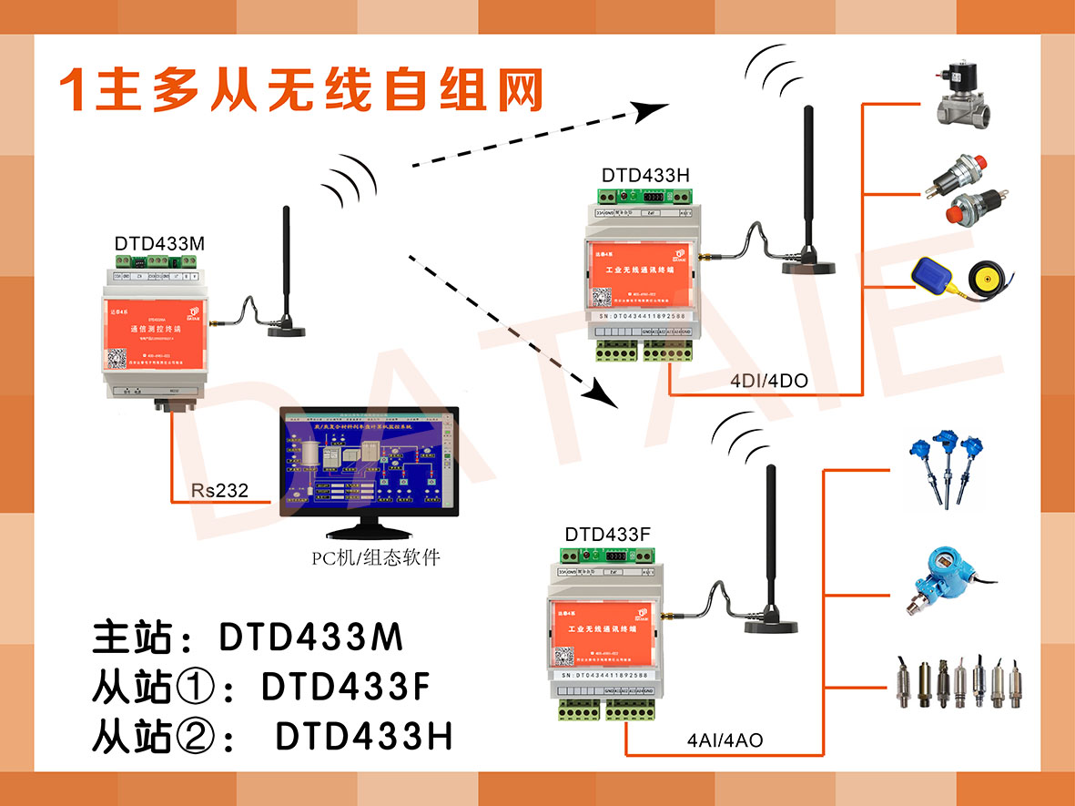 多點集群自組網通訊必須有一個主機(主站),主機型號為DTD433M、DTD434M、DTD435M無線通訊終端,才能與從機進行自組網無線通訊。從機(從站)可以采集開關量、模擬量信號,型號為DTD433H、DTD433F。一臺主機可與256個從機配套使用。所有從機的地址都是唯一的,不會存在從機間互相干擾的情況。