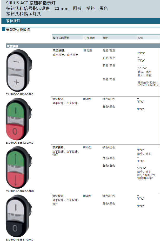 標準中建議優先用白色用于設備啟動,黑設用于設備停止,(也可以是綠起紅停)。論壇“老兔子”提醒是沒有對標準理解透徹或標準翻譯問題,我看了國外網站的英文版本標準,翻譯是準確,應該是沒有問題的。又對標準仔細閱讀了數遍,理解沒有問題,就是建議“白起黑停”。然后看了施耐德和西門子的按鈕選型,如下: