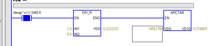 不用糾結了,程序上面沒問題,出來的結果就是這個,證明樓主的反三角函數庫這個庫文件沒問題,沒有出來度數,因為PLC內轉換的是弧度,你想要度數,可以用0.21869除以3.14乘以180度就可以出來度數了(你可以用in1=in2=1試試,結果出來是45度除以 180度乘以3.14的結果,就是弧度了),至于兩個vd0顯示的不一樣,應該是程序內部處理問題,建議用上升沿觸發一次指令試試,不采用長通點位,畢竟不知道庫文件里面程序是怎么玩的,只是建議。