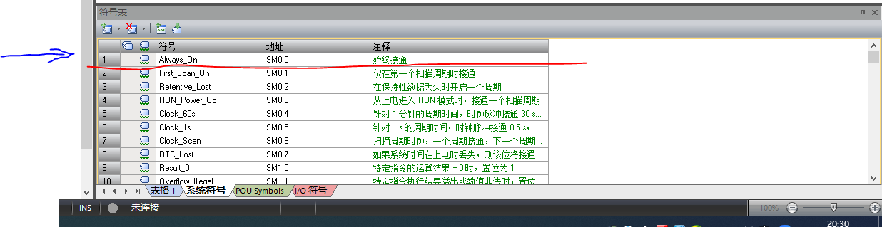 我的問題是:SM0.0不見了。本來輸入一個觸點就會有個快選項可以選擇Always on SM0.0的。我的不知道怎么不見這個選項了。