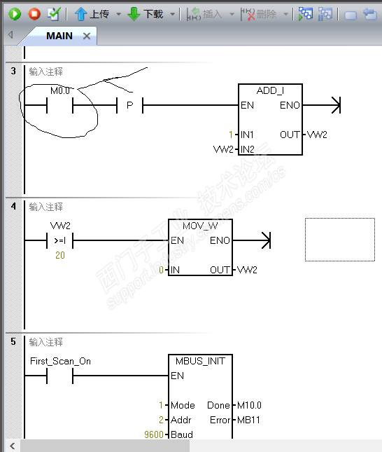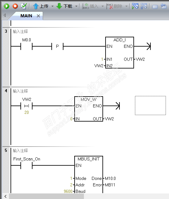 今天,找來(lái)一個(gè)MCGS7寸屏,和Smart200 plc進(jìn)行Modbus RTU通信,PLC程序還是VW地址自加1功能,