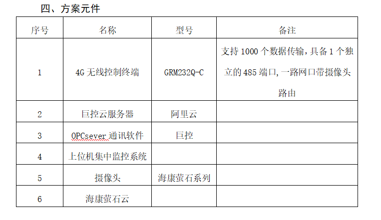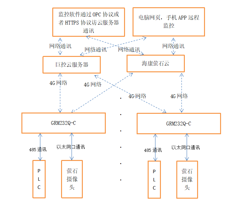 本方案采用4G無線數據采集的模式,方案采用無線4G路由器+巨控的GRM230系列網絡遠程控制模塊+海康螢石系列的攝像頭,通過巨控配套提供的免費云服務器+海康云服務器,而實現集中監控。方案拓撲圖如下: