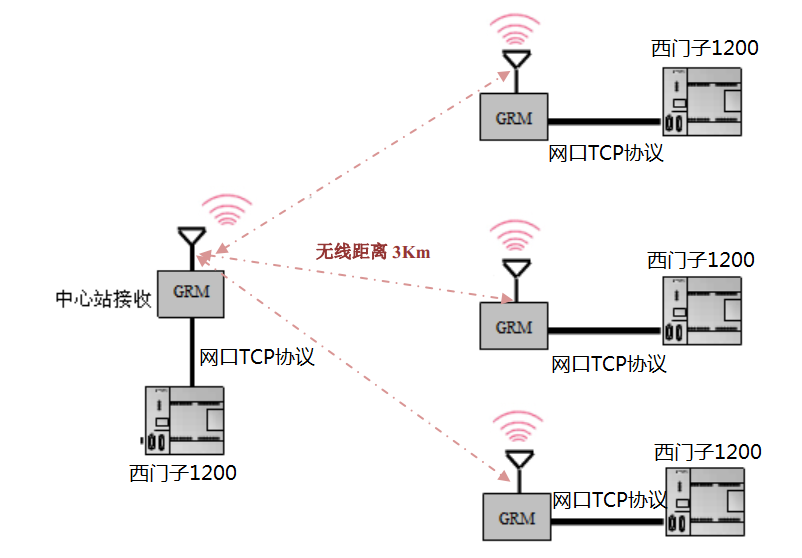 根據現場需求,可采用歐美系PLC無線通訊終端DTD434MC來實現裝煤車系統的無線改造。裝煤車駕駛室與就地PLC程控柜所用的PLC為西門子S7-1200。建立數據傳輸線路的無線通訊,也就意味著需解決三臺S7-1200 PLC之間1主2從的通訊問題。主站為位于煤塔的就地PLC程控柜,從站分別是兩輛裝煤車。將3塊歐美系PLC無線通訊終端DTD434MC分別通過S7-1200 PLC的Rs485接口對接,不需要再做其他設置,就可以實現3KM內3臺西門子S7-1200 PLC之間的無線通訊功能。