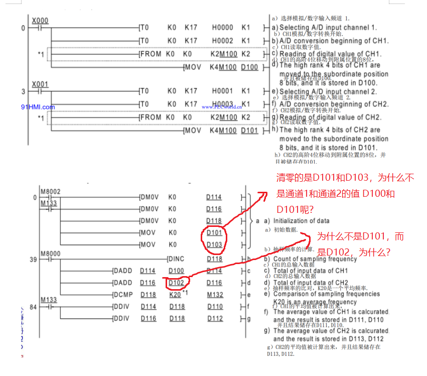 我覺得應該是下面DADD32位運算,所以D101和D103要清零。上面通道2的讀取值應該是D102,手冊上D101是錯的。還有一個不明白的是通道1和通道2為什么同時都是K2M100,難道不沖突嗎?百思不得其解啊。
