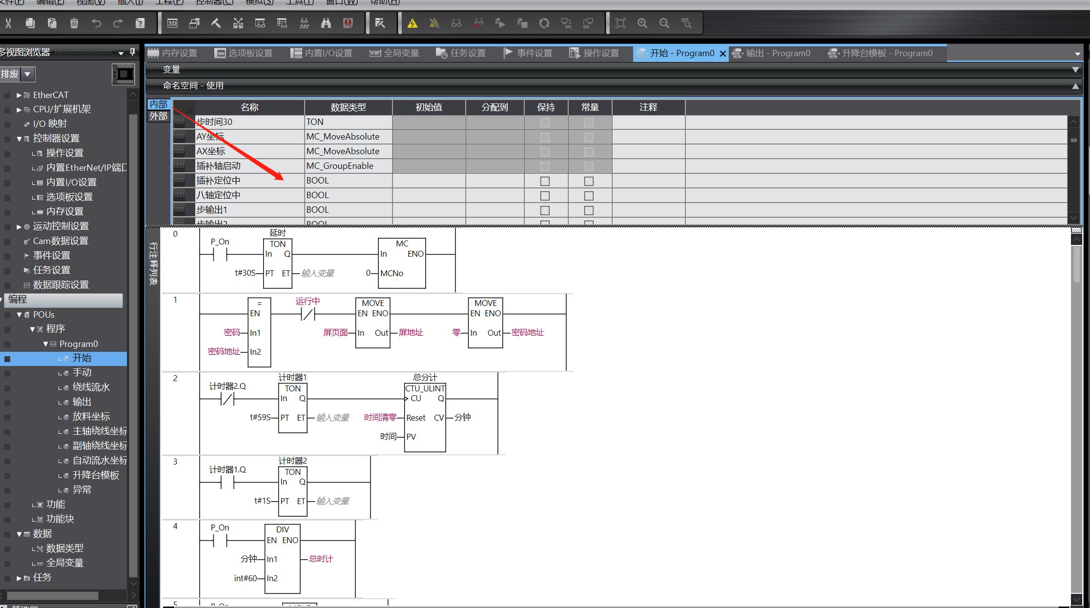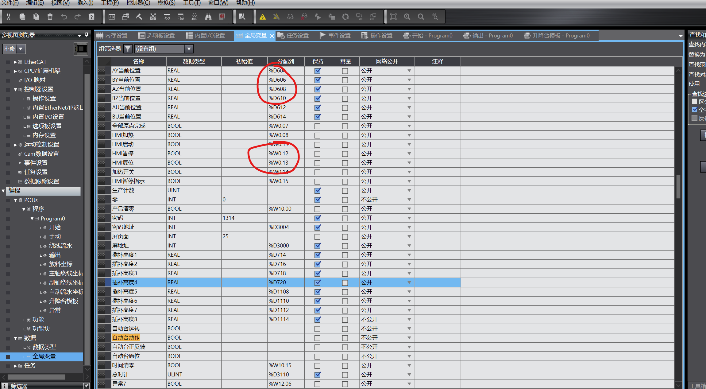 左側多視圖瀏覽器找到配置和設置,再找到控制器設置,內存設置打開,出來的cj系列單元的內存設置,需要用那個勾選哪個,基本上cio wr hr dm都勾選上,然后在編程,數據,全局變量里新建一個變量名為a,數據類型為bool,分配到為%W0.00,網絡類型選擇公開就是觸摸屏或其他plc能讀到,不公開就讀不到,分配為d時應勾選保持,否則報錯。好了,可以去測試一下了,祝順利