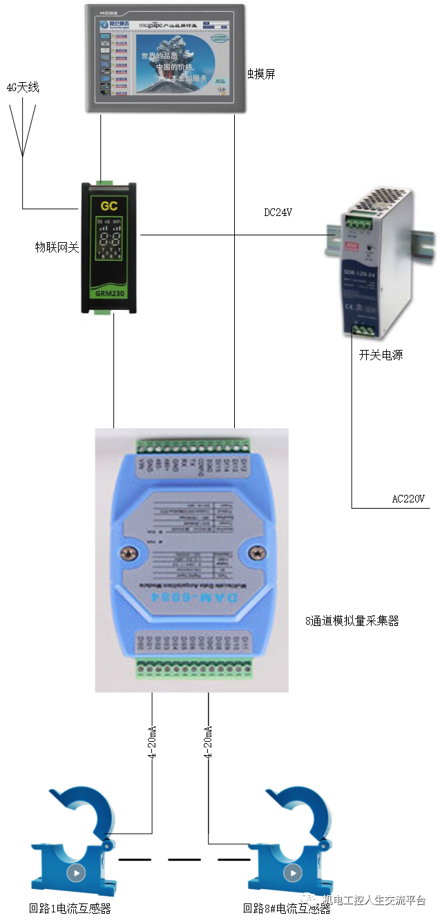 測量的回路安裝開口電流互感器,電流互感器輸出4-20mA,接入模擬量電流采集器,電流采集器通過RS485接口接入物聯網關,物聯網通過串口接入觸摸屏,觸摸屏編程實現數據顯示,數據報表,趨勢曲線等。