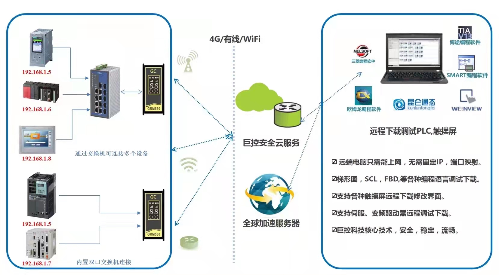 巨控GRM530全球多服務器部署,阿里云,騰訊云,百度云無縫切換。客戶可根據自己的位置和網絡狀況,選擇最佳服務器,速度提高30%以上。