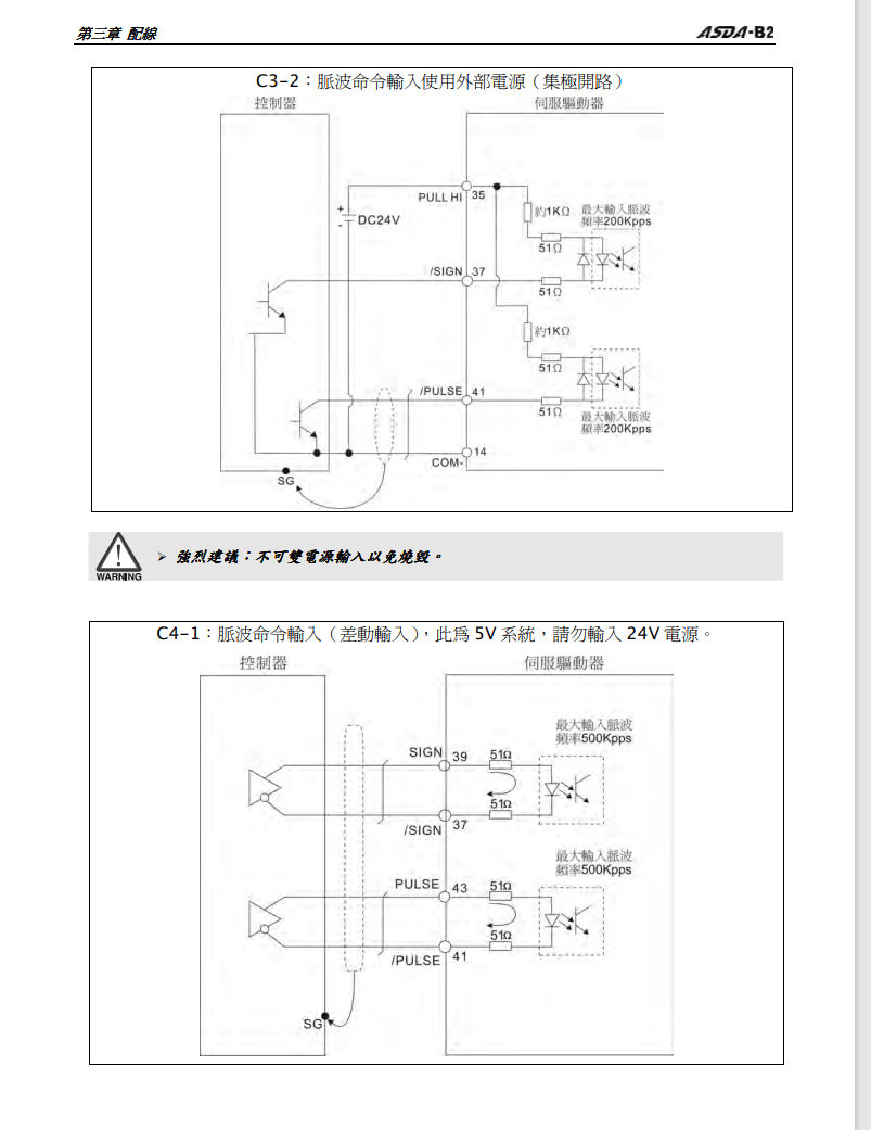 要不就是接線錯(cuò)了,電流方向不對。要不就是高速光耦因?yàn)榻泳燒了,我記得這個(gè)B2系列伺服驅(qū)動(dòng)器是分5v和24v的輸入的。