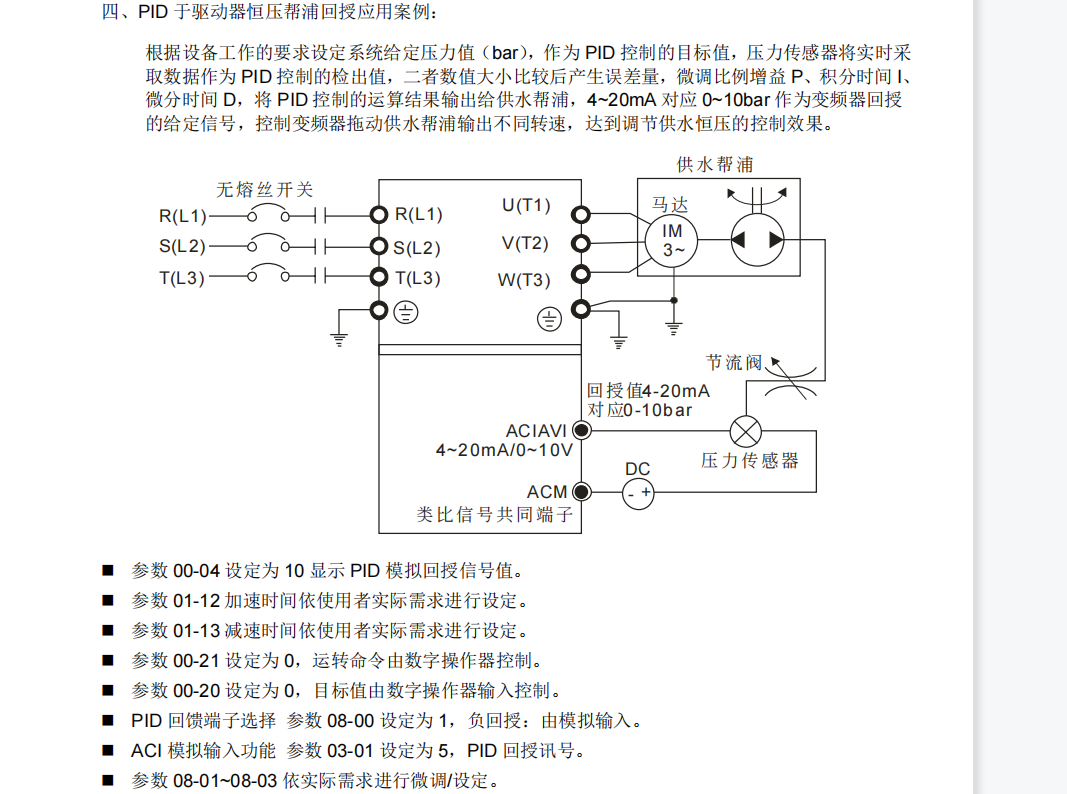 這個PID功能是變頻器內部算法完成的,使用時你只需要接上壓力反饋信號就行了,其大意是:當反饋回來的壓力值越大時,變頻器的運行頻率越低,反之越高,讓泵壓始終處于恒壓狀態,當然這個恒定壓力是根據需要人為設定的。