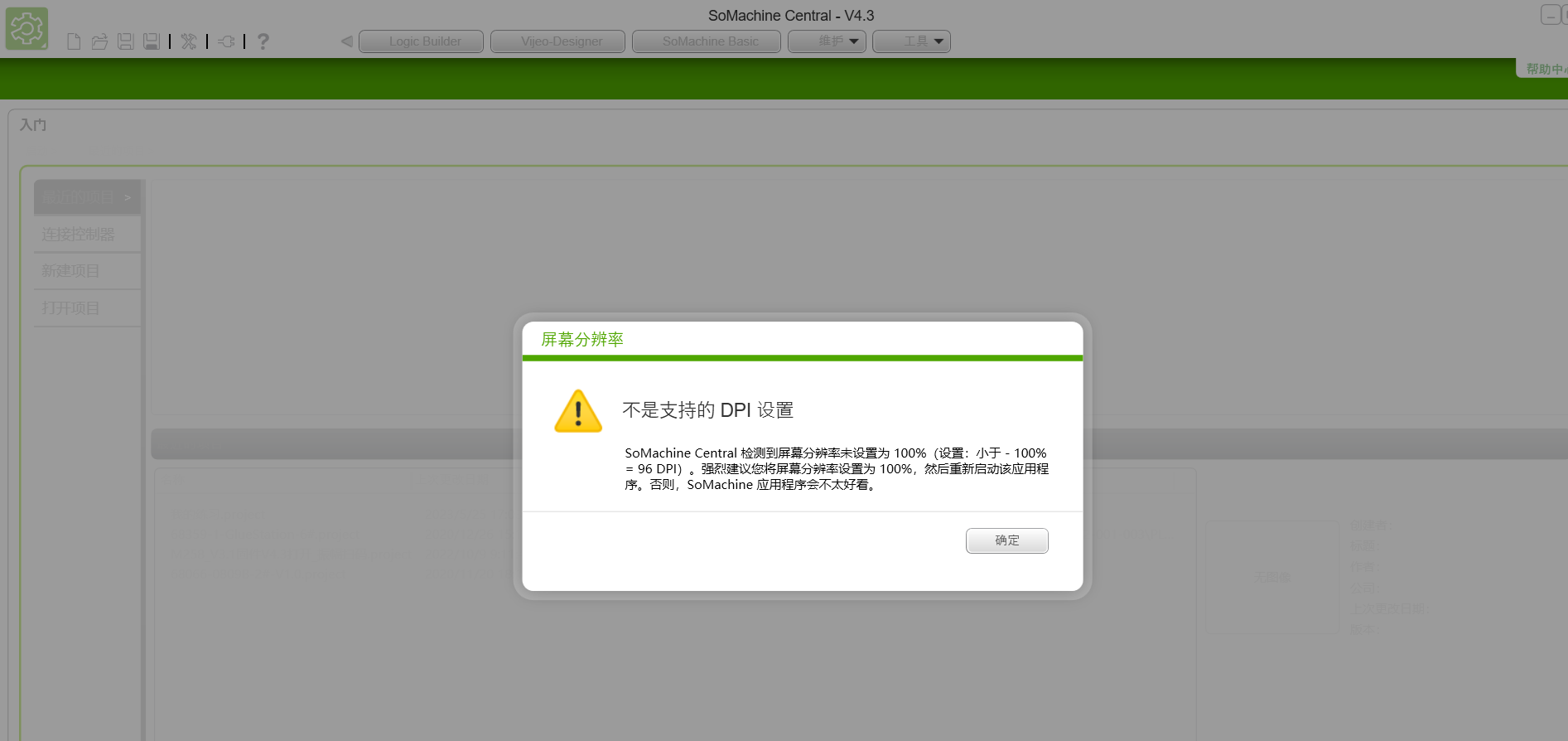 如圖,打開軟件時有此提示。如若點確定的話會自動跳出屏幕分辨率設置界面,但是如果不設置成他推薦的分辨率的話,軟件就會閃退。我用慣了當前的屏幕分辨率,如果調成了100%的話,圖標變得比較小,非常不習慣,各位大神有遇到過么,如何解決呢。