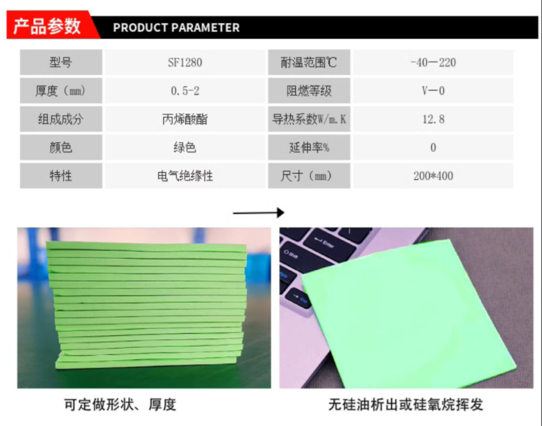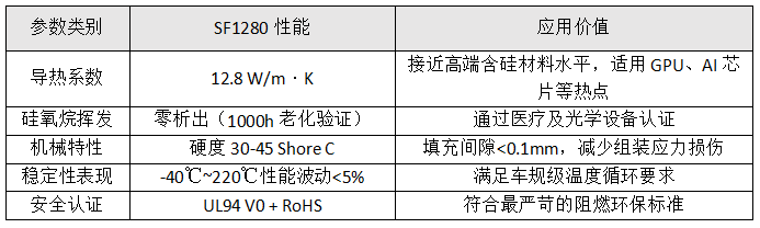 在無硅油導(dǎo)熱片領(lǐng)域,傲琪SF1280系列代表了當(dāng)前材料技術(shù)的先進水平,特別針對高功率密度和嚴苛環(huán)境需求設(shè)計: