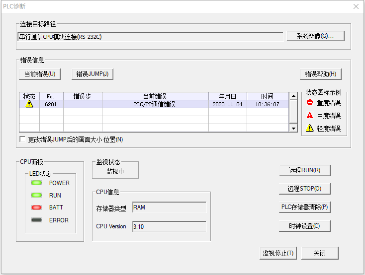 三菱FX2N PLC  BATT.V指示燈一直常亮(見圖片),用軟件檢測,顯示“6201”通訊錯誤,請問是上面問題?是不是該換電池了?