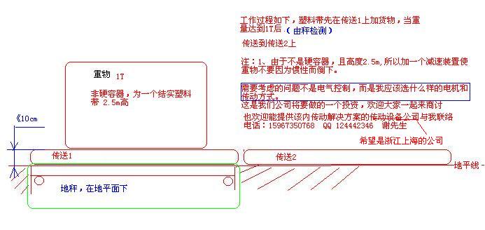 在傳送裝置1下有個(gè)地秤(秤在地面下),計(jì)量上面貨物的重量,當(dāng)重量達(dá)到1T后,貨物傳送到傳送裝置2上,如此往返.