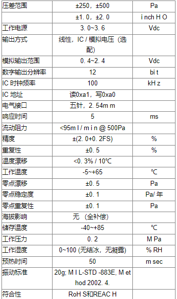 0至100m/s的流速測量范圍可以分為三個區段:低速:0至5m/s;中速:5至40m/s;高速:40至100m/s。風速儀的熱敏式探頭用于0至5m/s的精確測量;風速儀的轉輪式探頭測量5至40m/s的流速效果最理想;而利用皮托管則可在高速范圍內得到最佳結果。工采網的一款美國Siargo數字式微壓差傳感器- FSP1000系列靈敏度高,有極小的始動流量,響應速度快;具有低壓損輸出(E-I 2C;V-模擬電壓,可選E和EV ),壓差范圍(可選250和500);壓差范圍的單位為Pa,比如250代表壓差為。+250Pa傳感器的標準輸出為IC,模擬電壓輸出為選項。