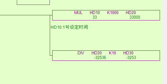第一行MUL的HD10如果不會超過32767不用加D,結果會放入32位的HD20,第二行用了HD20就必須用DDIV,如果還是用DIV會舍棄HD21里面的數值,值如果不超過32767不會出問題,超過了一點回出錯。不知道我回答的對不對