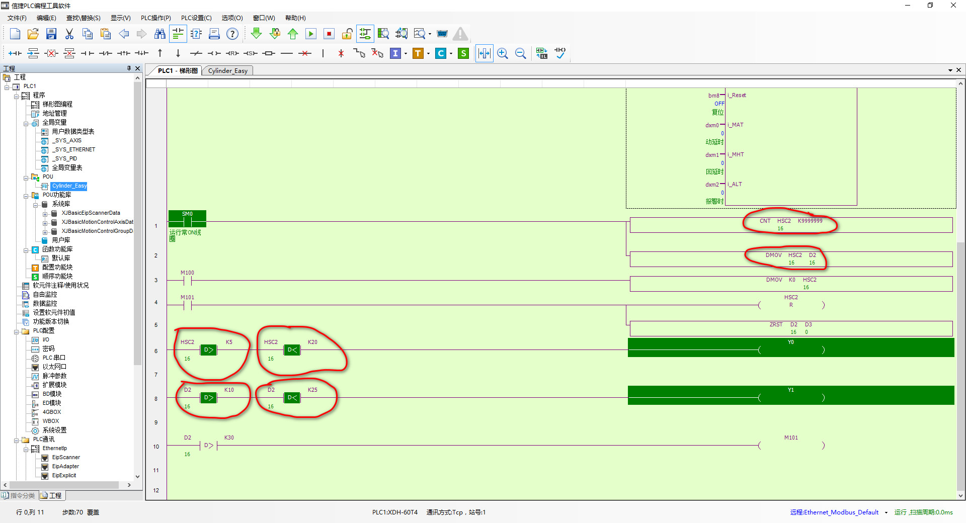 比如你程序中跟k5比較時hsc是50,跟k20比較時hsc為-50,那就會意外導(dǎo)通y0一個周期