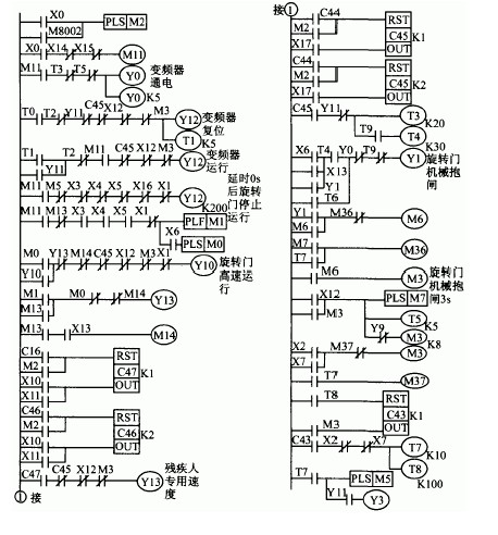 一送電或者X0接通【可能是復位或者是準備】,M2產生脈沖,把計數器C45 C46復位,【可能是回到起始位或者準備狀態】。X0接通,變頻器通電延遲0.5秒復位,同時延遲0.5秒進入運行狀態。。。。。。