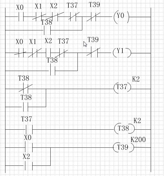 2、我分析圖中是0.1秒閃亮啊,假設(shè)閉合X0,T38通電,延時0.1秒后燈亮,T37通電延時開始,0.1秒后T37動斷觸點斷開,T38斷電,燈滅,隨即,t38又通電循環(huán)