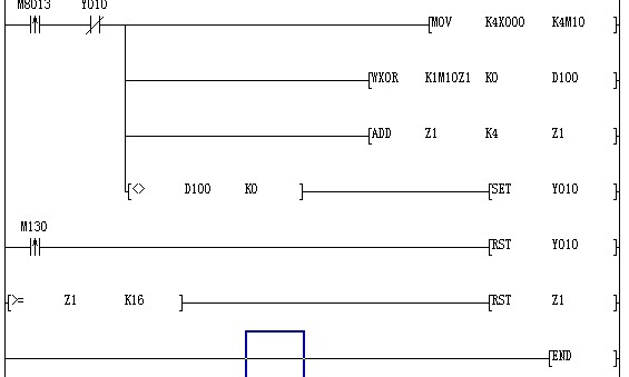 確實是這樣,第一次接通到END后Z1確實是=4,但是K4M10Z1那條指令讀到的z1值是0,因為還沒有掃描到ADD行。