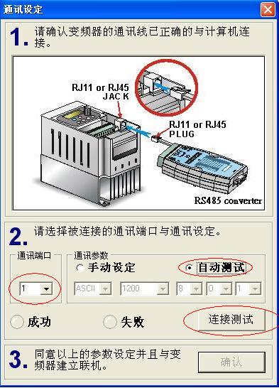 用力特USB TO RS485,型號是ZE413,與臺達變頻器VFD-M連接通信,在第2請選擇被連接的通訊端口與通訊設定,選擇自動測試,可以成功;在第3同意以上的參數設定并且與變頻器建立聯機,確認后出現(校驗出錯,將要再嘗試一次)的提示,請問問題在哪里?請指教,謝謝!