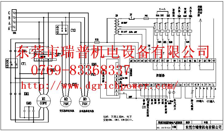 根據上述螺鋼牌螺桿式空壓機的工況,我們初步確定的方案為,采用MAM-KY02S VF型控制器代替它原來的系統,這樣改造簡單,而且控制器自帶PID,省去PID設置的麻煩,同時具有工變頻轉換功能,直接在控制器上面操作即可以時間變頻的轉換。人機界面操作方便,同時在安裝尺寸方面和MAM-KY06S是一樣的,安裝按原理位置方式安裝即可,也省去開孔等工序。變頻器采用22KW的國產品牌。有空壓機放置位置靠近墻壁,因此,變頻器也可以直接安裝在墻壁上,通過電纜線進行連接。根據我們電路原理圖設計的需要,再購買了交流接觸器,溫度控制器,軸流風扇。由于MAM-KY06S采用的壓力開關式控制器,而MAM-KY02S采用的壓力傳感器的方式,因此在購買MAM-KY02S時,需要再配套壓力傳感器。