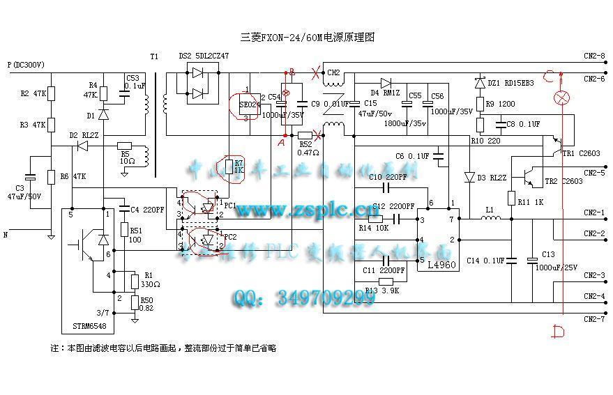 把電源板拆下,在cD點接入10—30瓦24v燈泡,上電檢測CD點的電壓是否正常,如正常則電源板沒問題,不正常你就從圖中X處斷開,把燈泡接在AB點,檢測AB點電壓如果正常,檢查R52是否開路,不正常檢查穩壓回路R7、PC1、SE024,過流保護PC2,這些元件正常的話就要考慮STRM6548;