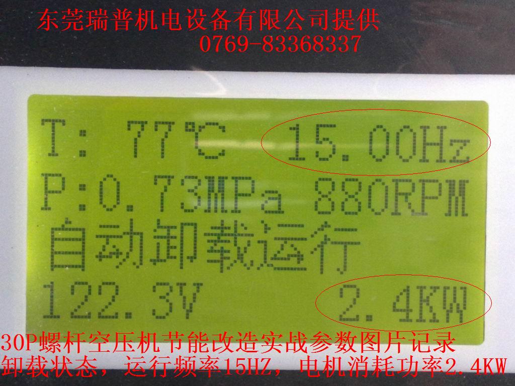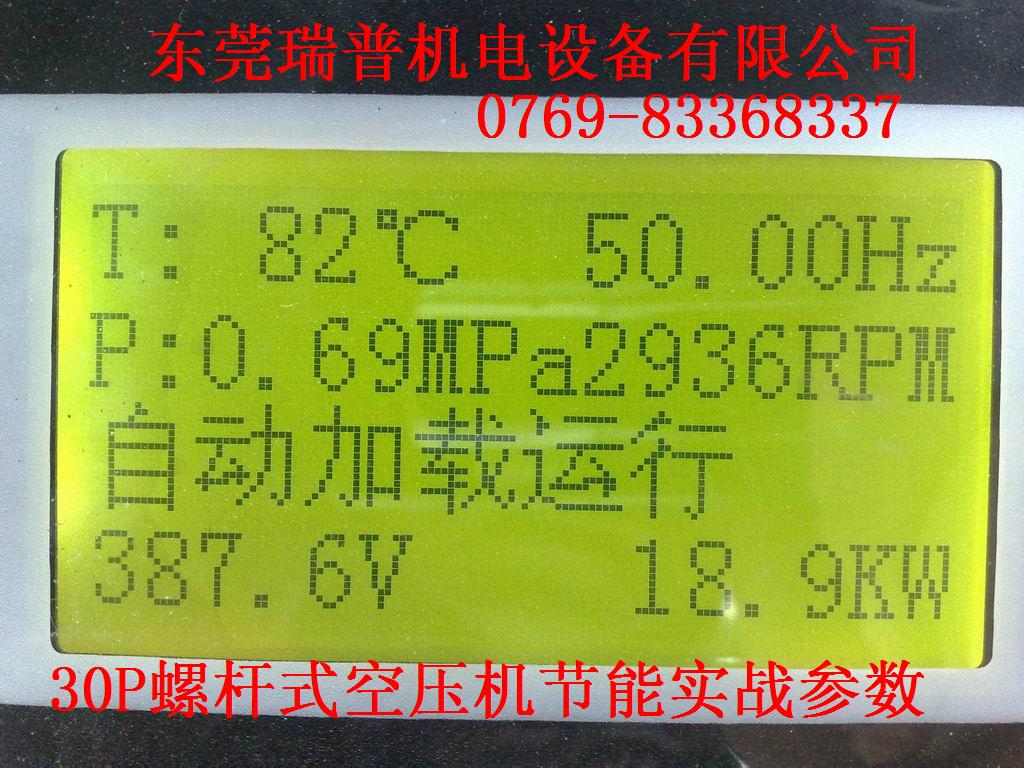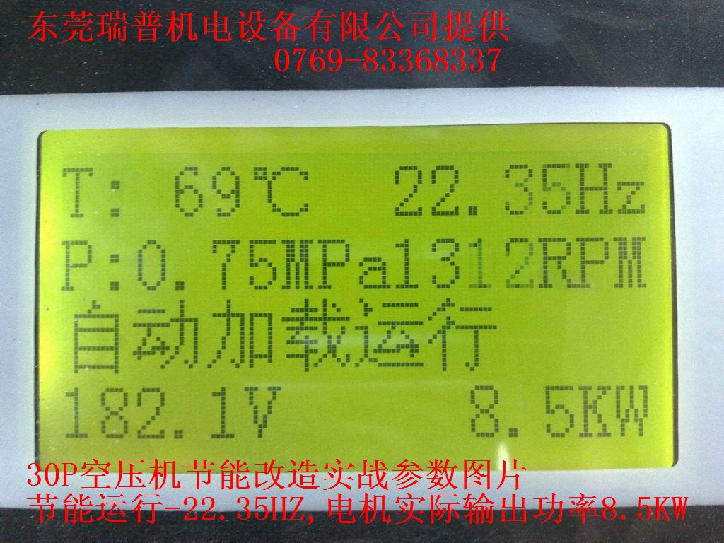 前兩天又改裝了一個30P的螺桿空壓機,現在把參數圖片發上來讓大家看看,到底空壓機變頻改造的節能效果怎么樣。讓大家在將來遇到客戶需要節能改造時,心里有個底。
