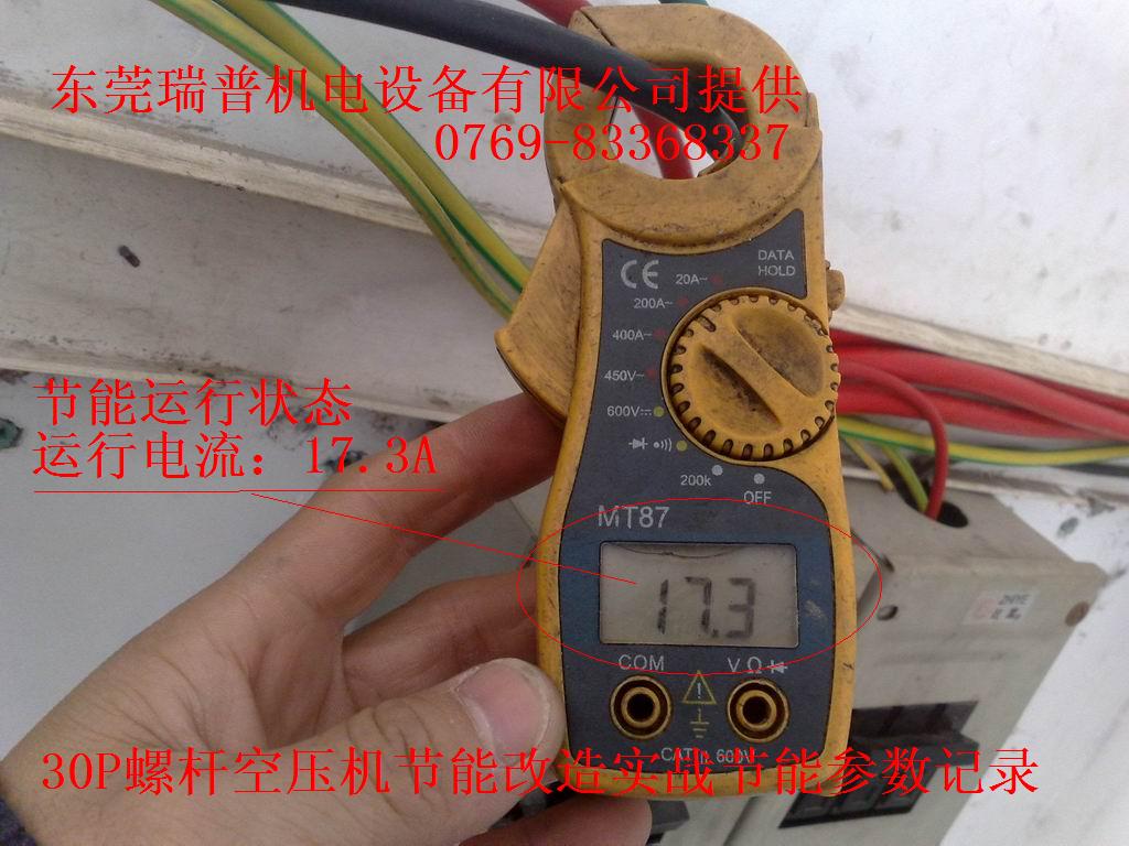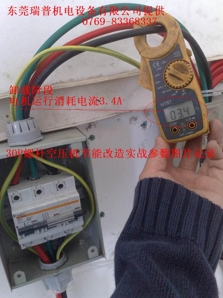 改造后,我們通過圖片的方式記錄了全功率運行,節能階段,卸載階段的輸入電流,電機實際運行功率等參數。