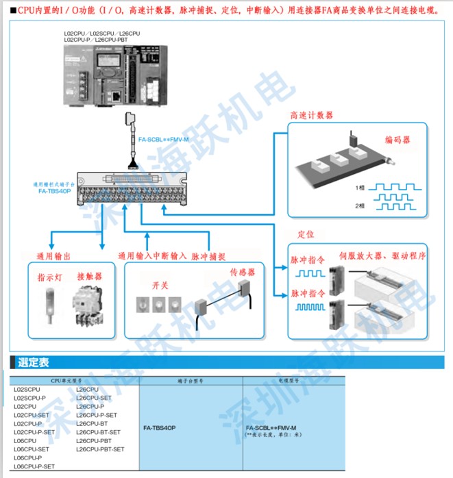 L系列PLC是三菱推出的新一代介于FX與Q之間的PLC,無基板可擴(kuò)展,集成以太網(wǎng)和CC-LINK,實(shí)用性強(qiáng),而且改變了以往Q系列主機(jī)無接線端子臺(tái)的j尷尬,目前日本已經(jīng)有端子臺(tái)的型號(hào):FA-TBS40P,配套電纜的型號(hào)是FA-SCBL10FMV-M(10代表長(zhǎng)度一米,20為二米,以此類推)