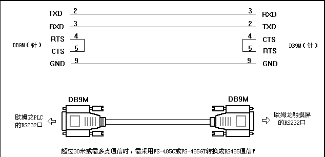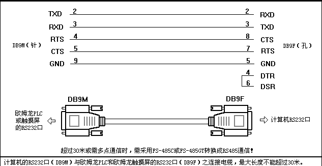 描述:歐姆龍PLC的RS232口(DB9F)與歐姆龍觸摸屏的RS232口(DB9F)之連接電纜