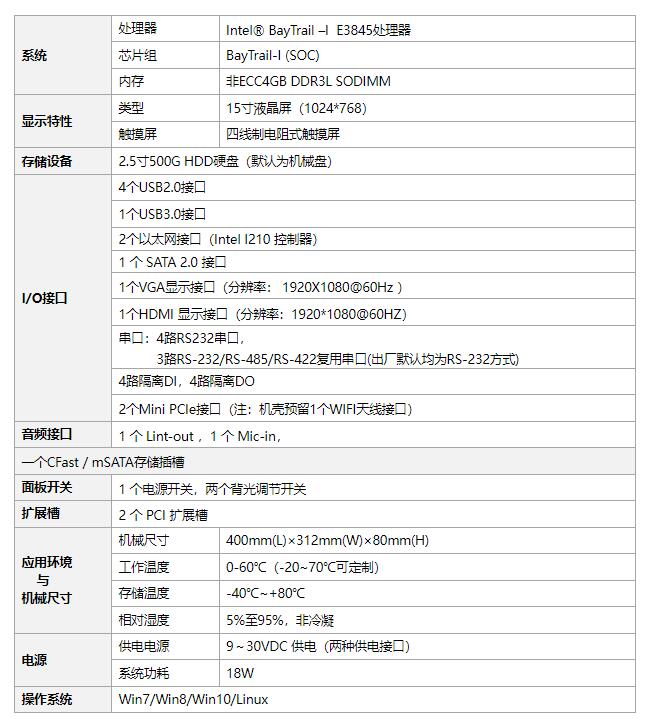 PPC-15A1 是一款配置 15"液晶屏及觸摸屏的無風扇低功耗工業(yè)平板電腦,采用Intel®AtomE3845(2M Cache,1.91 GHZ)CPU,內置非 ECC 4GB DDR3L SODIMM 內存條,具有多種接口。整體平臺具有更強的圖形處理能力,更快的處理速度,全尺寸觸摸屏操作。本產品可選配置帶有兩個擴展插槽(PCI 或 PCIe),可獨立安裝與拆卸相應的板卡。