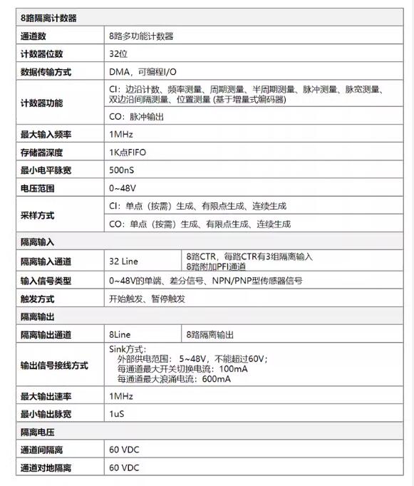 PCI總線,8路隔離計數(shù)器模塊,支持帶緩沖采樣;可采集高達48V的電壓;附加了8路額外的PFI輸入通道;與LabVIEW無縫連接,提供圖形化API函數(shù)。