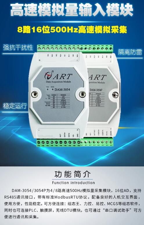 DAM-3054P為8路差分模擬量采集模塊,高速采集,16位AD,支持RS485通訊接口,帶有標準ModbusRTU協議。配備良好的人機交互界面,使用方便,性能穩定。