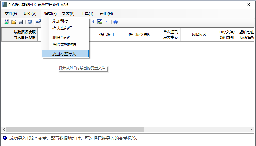 本案例采用西門(mén)子1200的PLC跟匯川H5U的全局變量標(biāo)簽方式通訊,通過(guò)智能網(wǎng)關(guān)的參數(shù)軟件(在附件中)選擇PLC之間通訊的功能,通過(guò)(編輯->變量標(biāo)簽導(dǎo)入)加載從H5U的PLC內(nèi)導(dǎo)出的HMI監(jiān)控變量表,如下圖,導(dǎo)入成功后在狀態(tài)消息欄有提示: