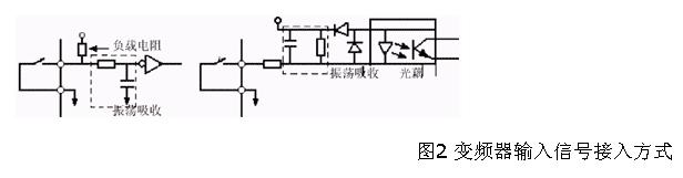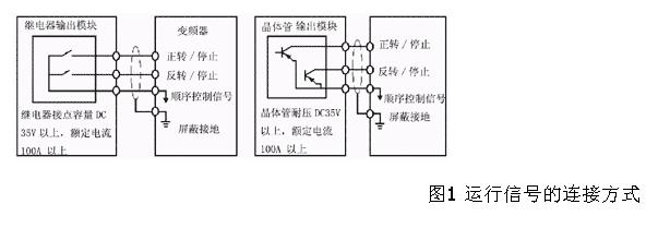 變頻器的輸入信號(hào)中包括對(duì)運(yùn)行/停止、正轉(zhuǎn)/反轉(zhuǎn)、微動(dòng)等運(yùn)行狀態(tài)進(jìn)行操作的開(kāi)關(guān)型指令信號(hào)。變頻器通常利用繼電器接點(diǎn)或具有繼電器接點(diǎn)開(kāi)關(guān)特性的元器件(如晶體管)與PLC)相連,得到運(yùn)行狀態(tài)指令,如圖1所示。