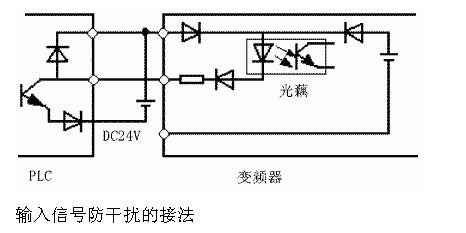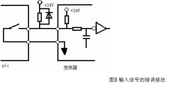 當(dāng)輸入開(kāi)關(guān)信號(hào)進(jìn)入變頻器時(shí),有時(shí)會(huì)發(fā)生外部電源和變頻器控制電源(DC24V)之間的串?dāng)_。正確的連接是利用PLC電源,將外部晶體管的集電極經(jīng)過(guò)二極管接到PLC。如圖4所示。