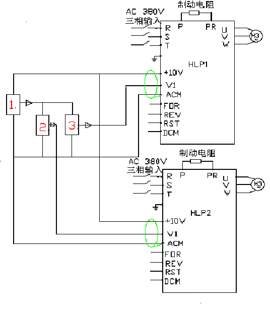以第一臺為主,第二臺的給定接于第一臺的直流電壓輸出,調試時打一同步。這只是近似同步,如果要真正同步第二臺最好再加以傳感器進行pid調節。