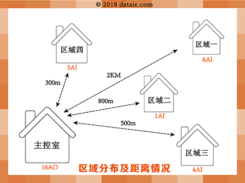 每個區域距離主控室的直線距離及傳輸信號路數如下圖所示 ▼