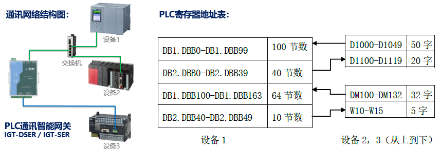 端口參數設置完成、確定網關與PLC設備通訊正常后,再配置PLC通訊的寄存器地址,按照上述任務配置好的數據通訊表如下圖: